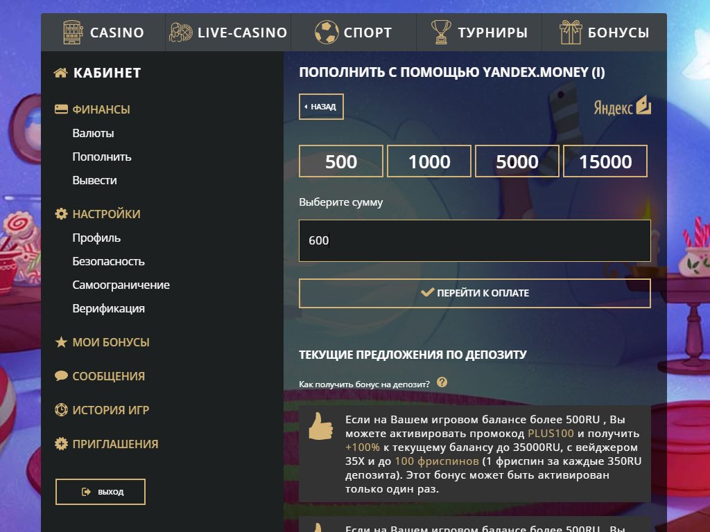 - 100% на первый депозит. Сделав первое пополнение счета на 1000 рублей, игрок получит от клуба в два раза больше денег. По этому бонусу администрация просто удваивает внесенную клиентом сумму;